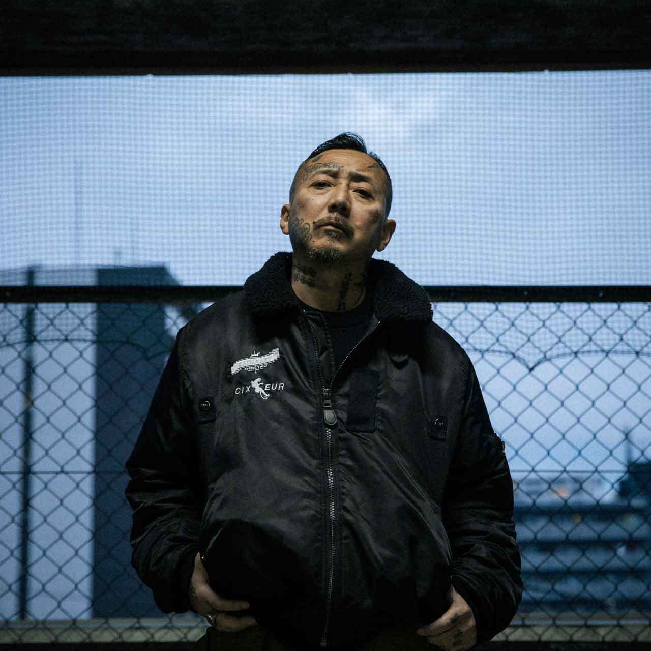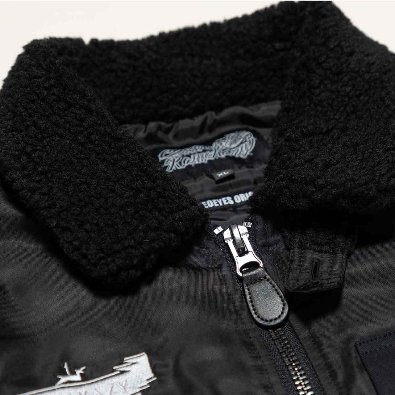 トレンドを意識した、ワイドな身幅に対し、着丈を短く設定したシルエット。ベースのB-15は豊橋のTATTOO STUDIOオリジナルブランド“XEOEYES ORIGINAL”監修。