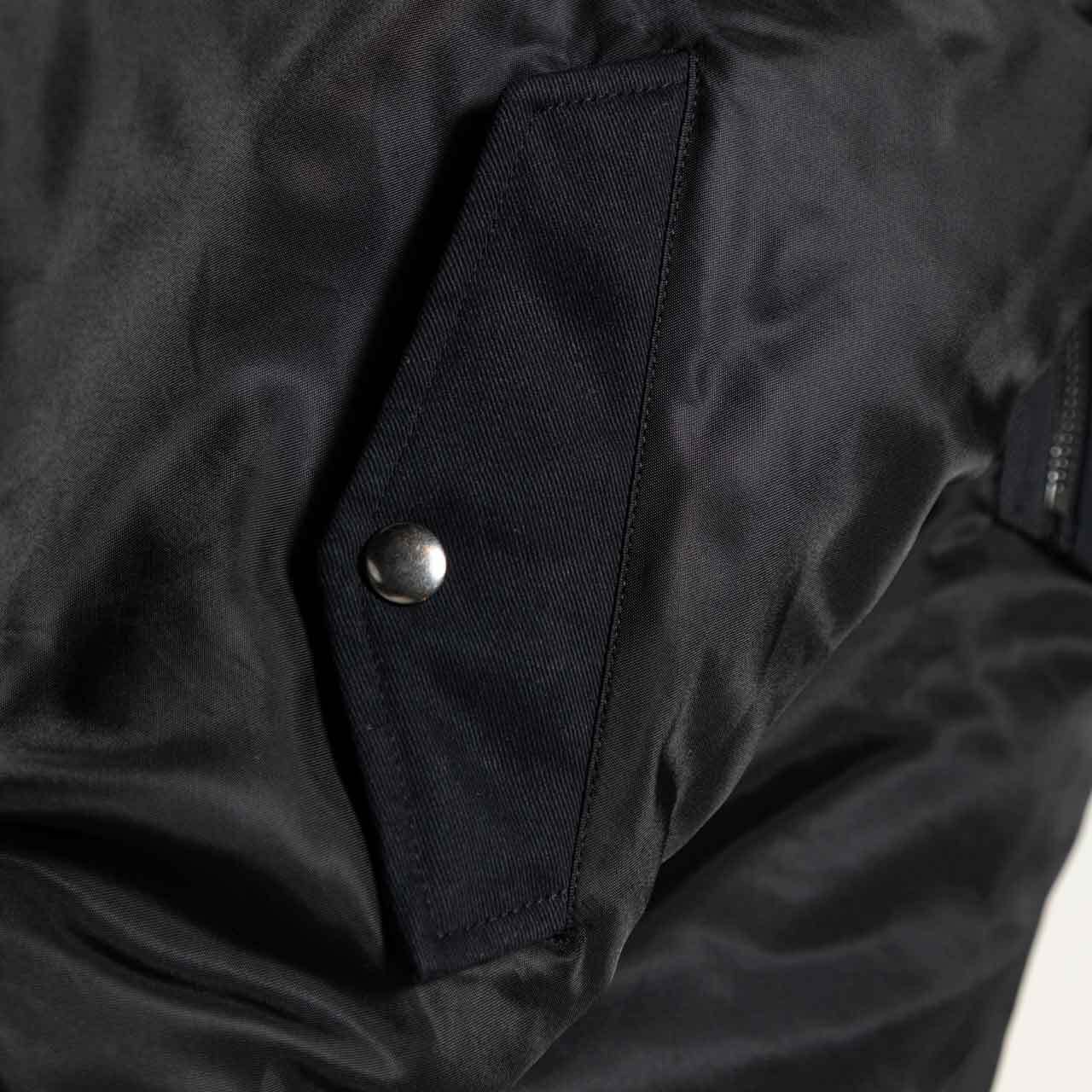 クラシックなボンバージャケットB-15をオリジナルボディでリリース。ベース生地はミリタリー定番のナイロン・サテン素材を使用し、ポケットフラップや、袖のポケット等には、着込むほど味が出るダック生地を採用。